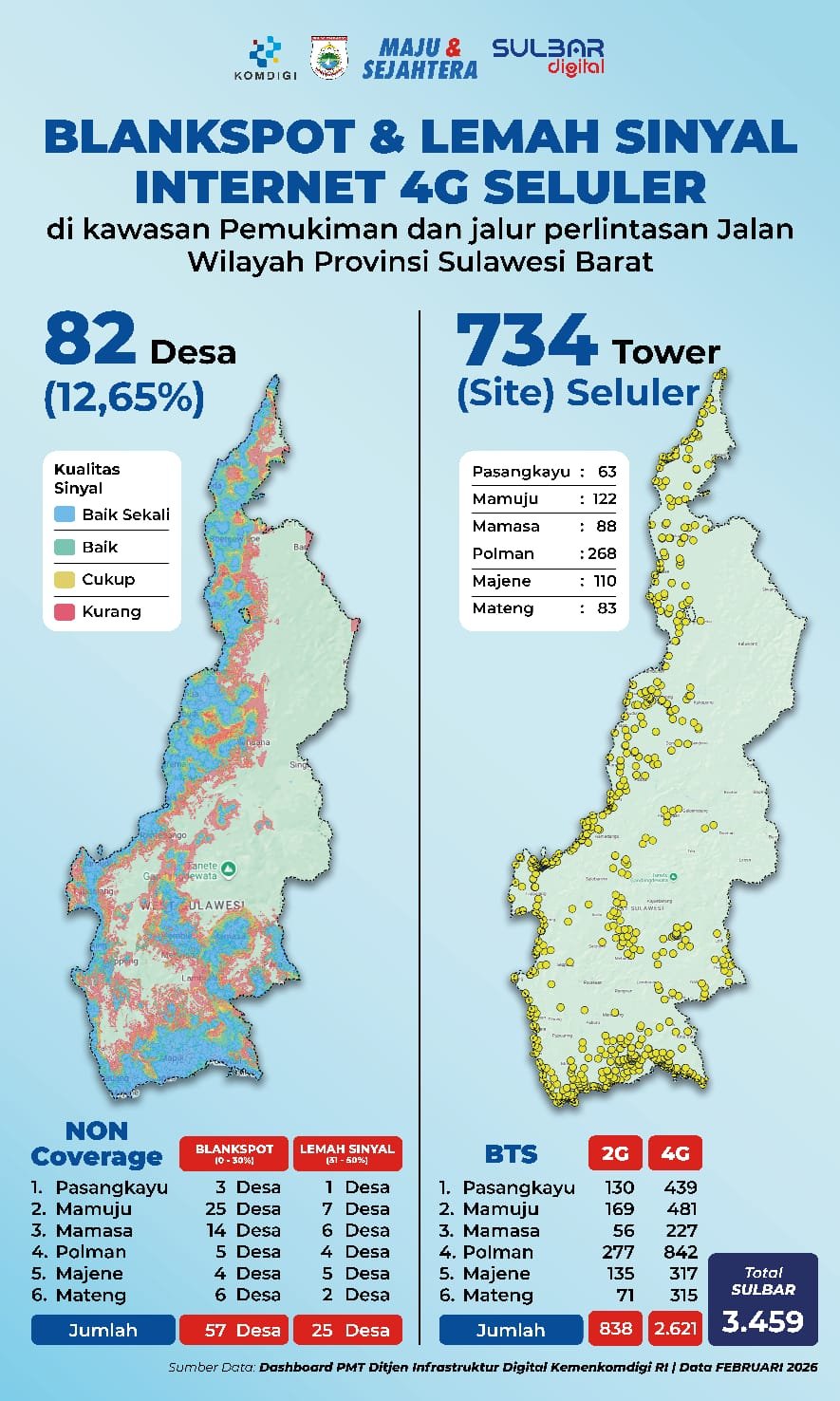 Berdasarkan Dashboard PMT Ditjen Infrastruktur Digital Kemenkomdigi RI per Februari 2026, Sulbar masih mencatat 82 desa atau 12,65 persen wilayah pada kondisi non-coverage. Rinciannya, 57 desa masuk kategori blankspot dan 25 desa berada pada kondisi sinyal lemah.