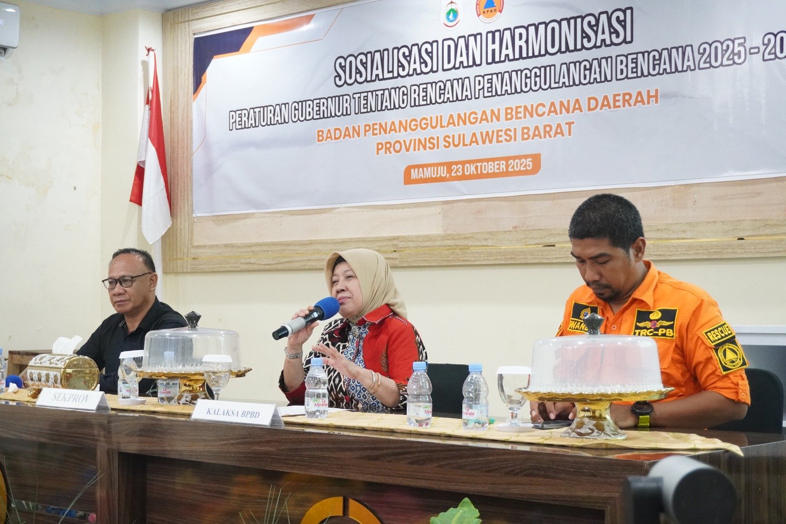Mamuju – Kepala Bidang Kedaruratan dan Logistik BPBD Provinsi Sulawesi Barat (Sulbar), Arnidah, memberikan masukan penting dalam kegiatan Sosialisasi dan Harmonisasi Peraturan Gubernur (Pergub) tentang Rencana Penanggulangan Bencana (RPB) Provinsi Sulawesi Barat Tahun 2025–2029, di Hotel Grand Putra Mamuju, Kamis 23 Oktober 2025.