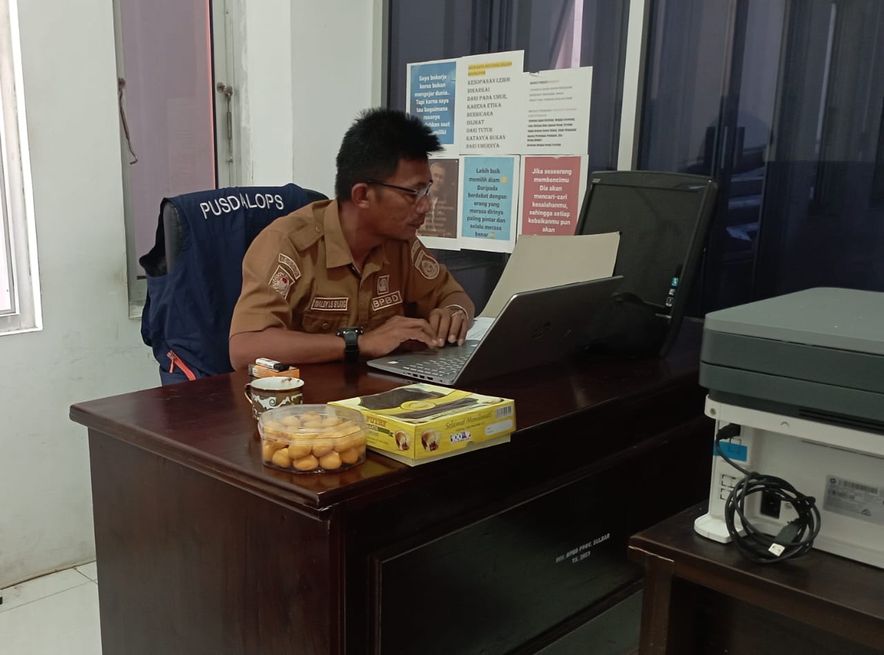 Sulbar – Penata Penanggulangan Bencana Ahli Muda BPBD Provinsi Sulawesi Barat (Sulbar), Inaldy L.S. Si’lang, mengikuti secara daring Rapat Monitoring Kondisi Pembangunan Sarana Prasarana (Sarpras) dan Pengadaan Peralatan Teknologi Informasi dan Komunikasi (TIK) Pusdalops BPBD, yang dilaksanakan oleh Pusdalops BNPB RI, Senin 27 Oktober 2025.