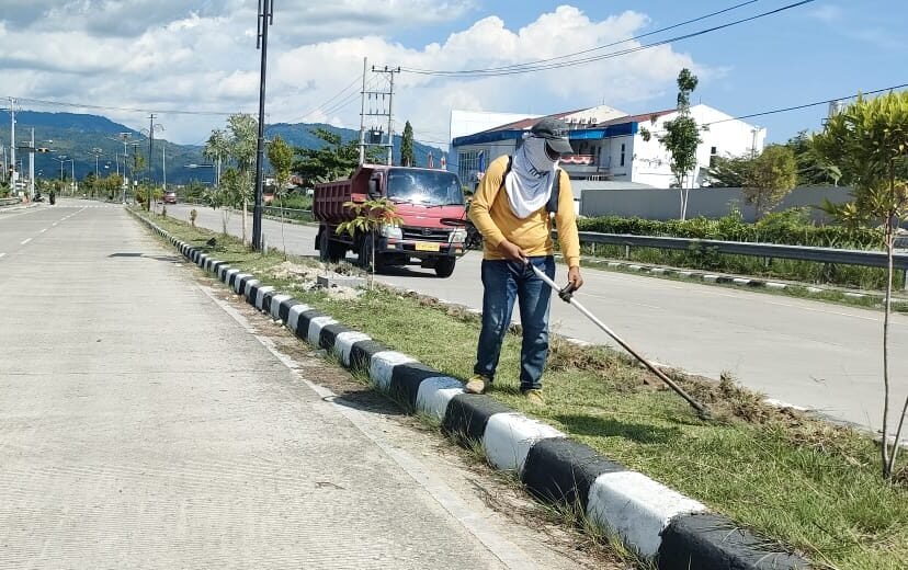 Mamuju – Menyongsong HUT ke-80 RI, Dinas PUPR Sulbar melaksanakan kegiatan pemeliharaan dengan memotong rumput di sepanjang ruas Jalan Arteri Mamuju.