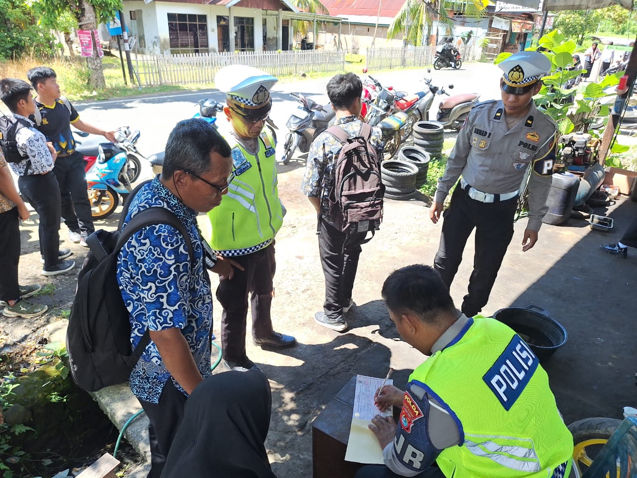 Siswa yang melanggar aturan tidak memakai helm menerima teguran tertulis. Teguran itu ditandatangani petugas kepolisian dan wali kelas sebagai bentuk komitmen bersama.