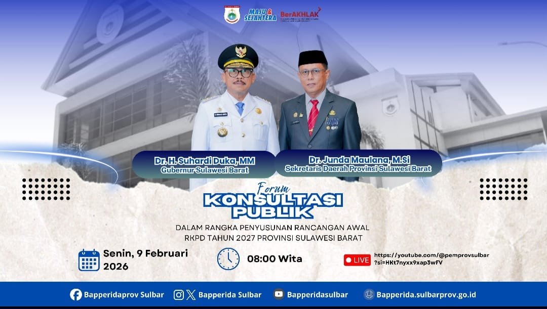 Mamuju – Bapperida Sulbar menjadwalkan Forum Konsultasi Publik Rancangan Awal Rencana Kerja Pemerintah Daerah (RKPD) Sulbar 2027 pada Senin, 9 Februari 2026.