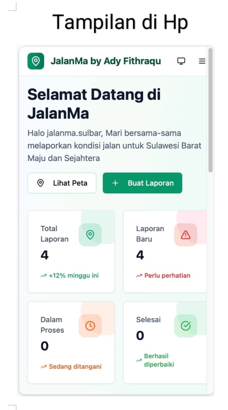 Pemprov Sulbar juga menyiapkan laman khusus berbasis web : https://app–jalan-ma-76c7c030.base44.app, untuk masyarakat yang lebih nyaman melapor melalui handphone atau komputer.