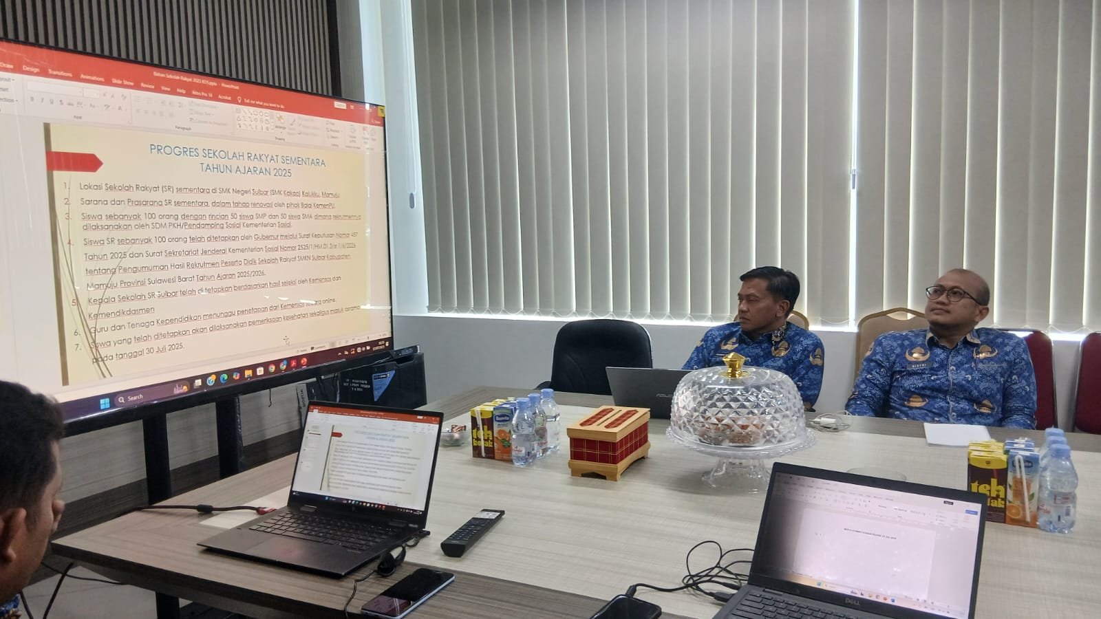 Rapat dipimpin oleh Kepala Dinas Sosial Sulbar, Abdul Wahab, dan dihadiri oleh sejumlah Organisasi Perangkat Daerah (OPD) Pemprov Sulbar yang teknis terkait. Dari BPKPD Sulbar, hadir Kepala Bidang Barang Milik Daerah, A. Bisyri M. Noor, serta Kasubid Penganggaran Pendapatan dan Belanja Operasi, Muhammad Apriadi, guna memberikan dukungan teknis dan fiskal terhadap persiapan pembukaan sekolah rakyat tersebut.