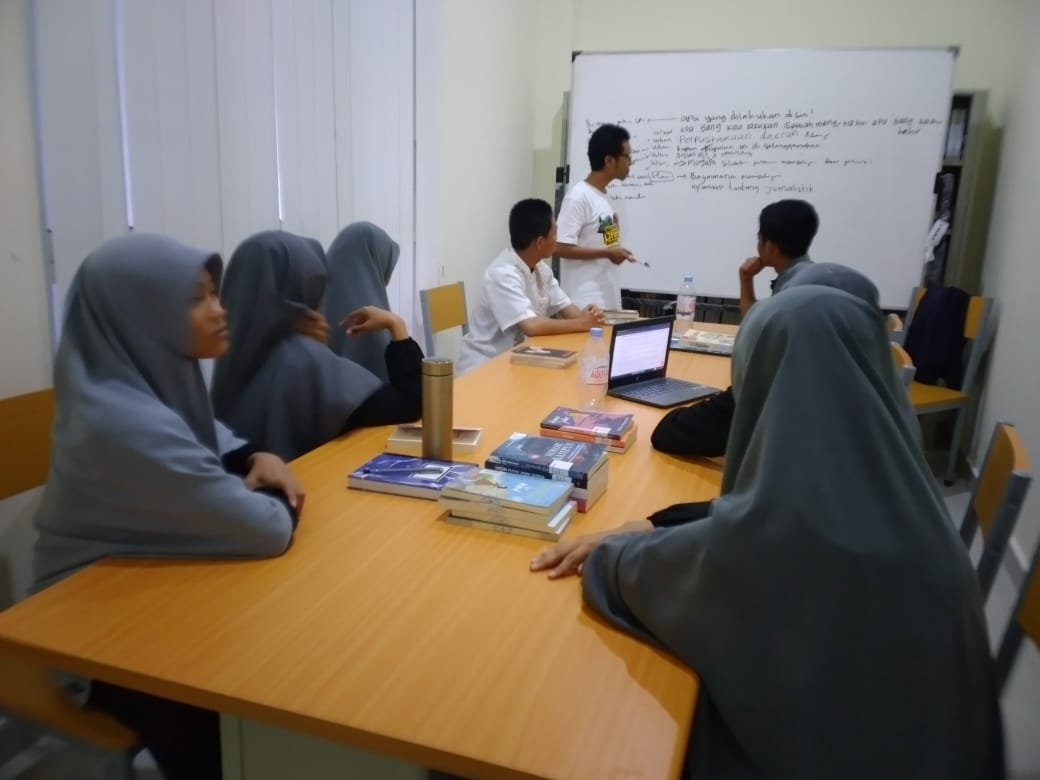 Di sana, pelajar itu mendiskusikan bidang jurnalistik. Mereka hendak belajar seputar pemberitaan untuk mendokumentasikan berbagai aktivitas di sekolahnya.